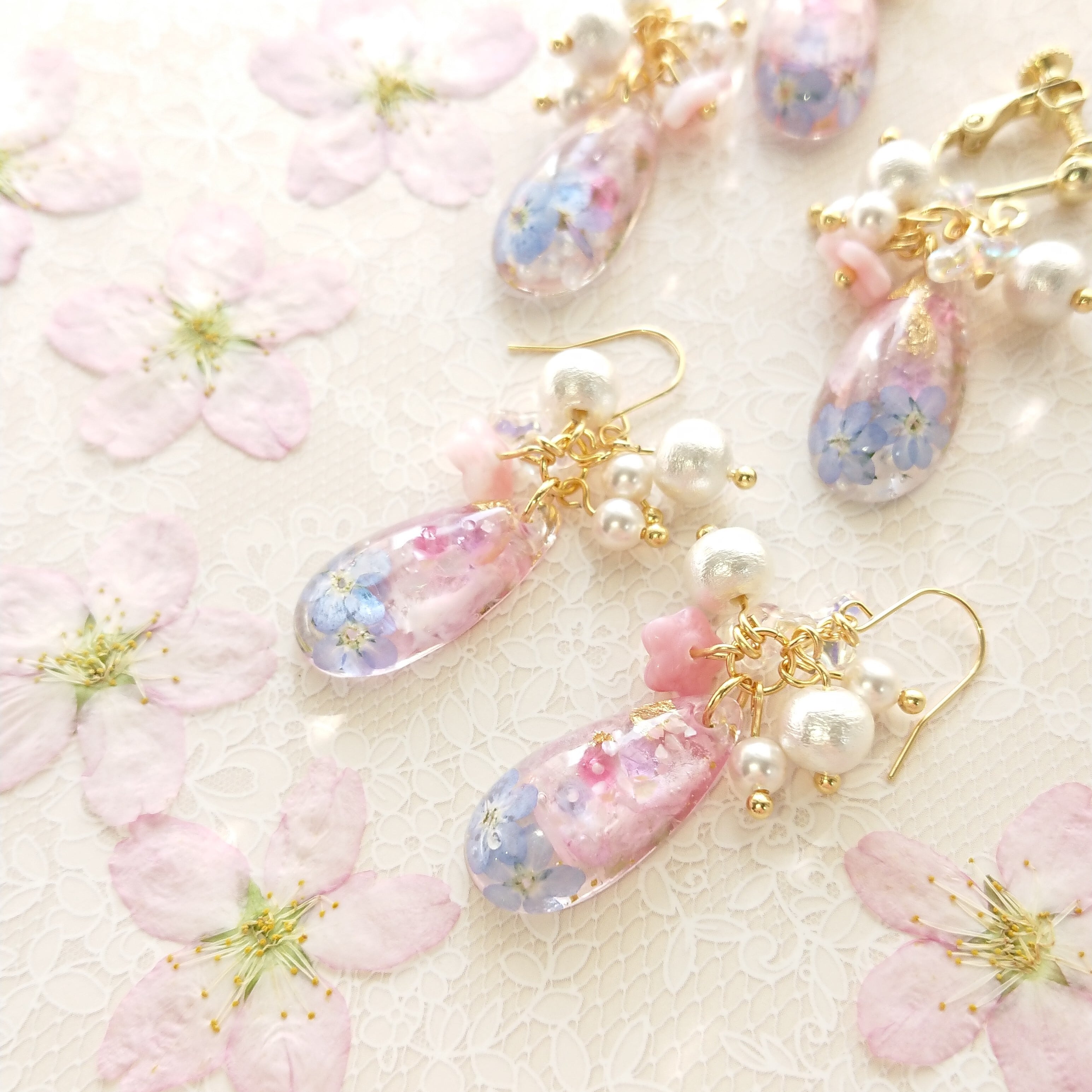 ピアス:金属部分すべてサージカルステンレス、スワロフスキークリスタル、スワロフスキーパール、コットンパール、レジン、チェコビーズ、勿忘草の押し花、桜の押し花
