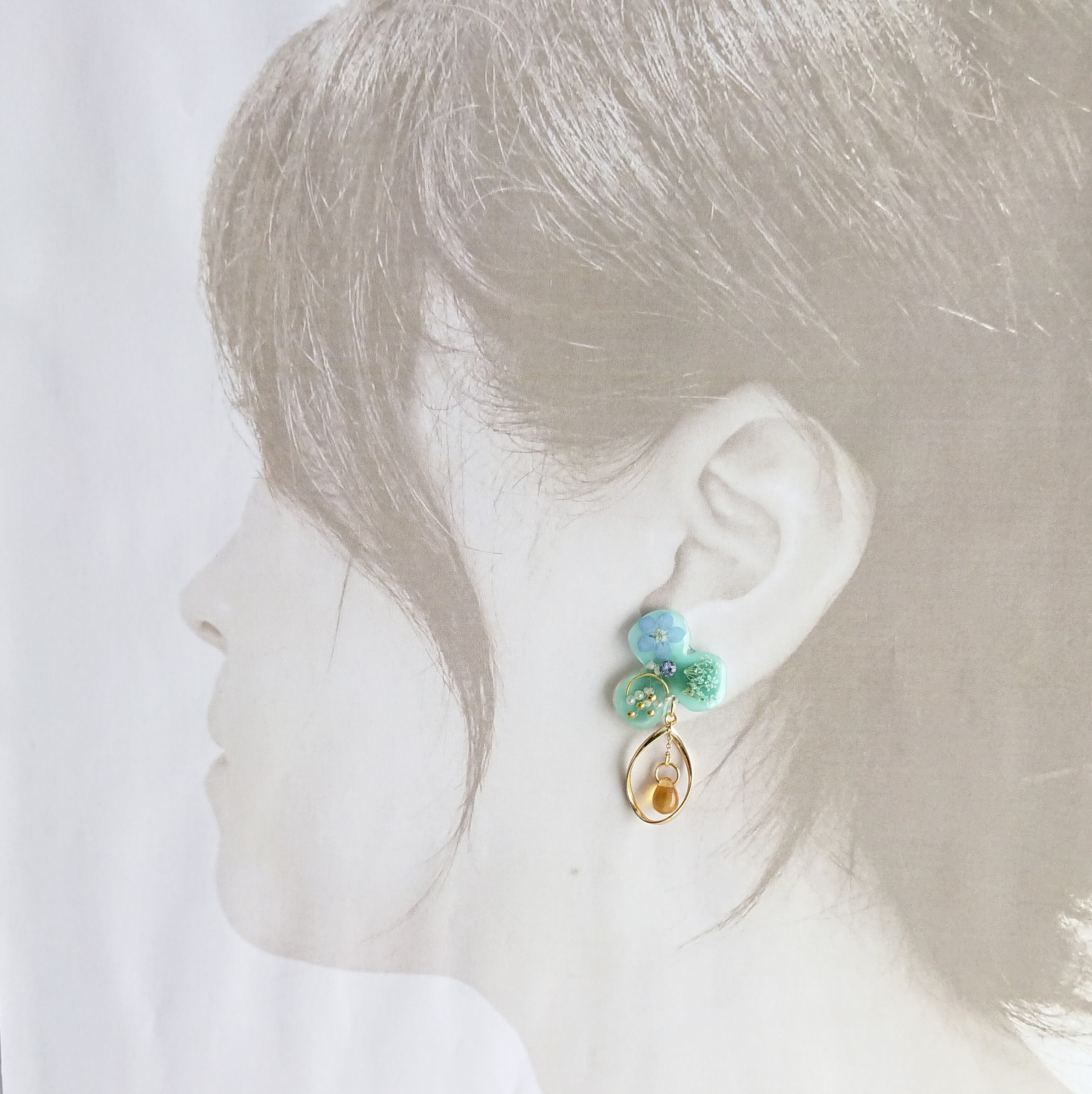 癒しのグリーンクローバーとはちみつがモチーフの揺れる耳飾り♡