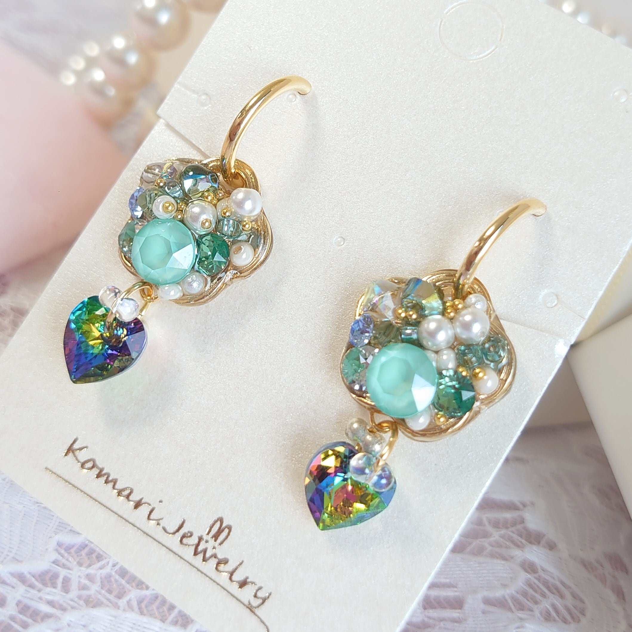 縁起物の水引クリスタルの耳飾り「多色グリーン」